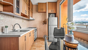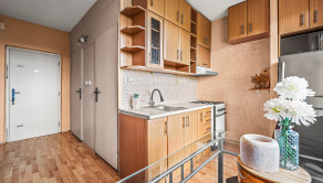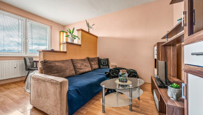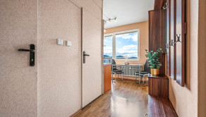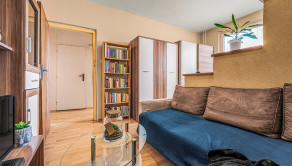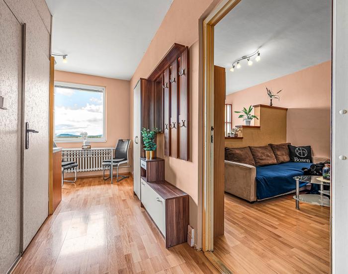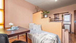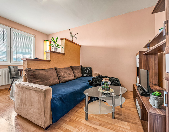 DISPOZÍCIA: Vstupná chodba s vešiakovou stenou a botníkom, po ľavej strane sa nachádza kúpeľňa s vaňou a samostatné WC, kuchynská časť prepojená s jedálenským stolom, výstup na balkón sú priamo oproti vstupu do bytu. Po ľavej strane od vstupu sa nachádza izba, ktorá je predelená optickou priečkou miestnosti na spaciu a obývačkovú časť.