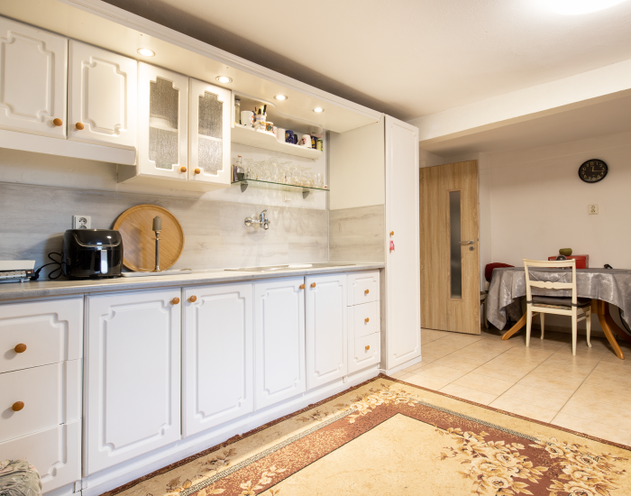 Do pivničnej časti domu sa dá dostať cez predsieň pri hlavnom vstupe, alebo z dvora. Je to kompletne zariadený 3.-izbová byt, s novou kúpeľnou, zariadenou kuchyňou, obývacou izbou, s dvoma spálňami a nesmieme zabudnúť ani na posilňovňu. S veľkej predsiene sa vchádza do garáže s automatickým otváraním brány.