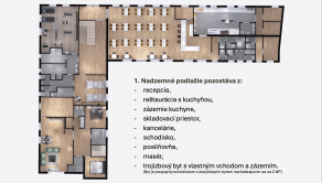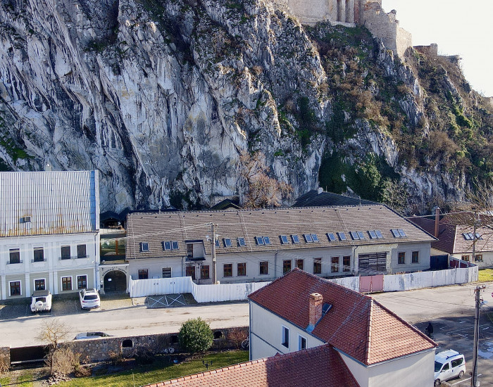 BUDOVA: Jedná sa o budovu so zastavanou plochou 618 m2 a ponúkame ju v štádiu výstavby tak ako je vidieť na fotografiách inzerátu. Budova je riešená ako dvojpodlažný objekt a má tvar písmena L čo vytvára uzavreté súkromie vzadu za objektom. Budova je jedinečná svojou lokalitou pod hradnou skalou. Jednoduchá, logicky tvorená hmota objektu je zastrešená sedlovou strechou s tmavo-šedou strešnou krytinou.Nehnuteľnosť má dostatok presklených plôch z reštaurácie a obytných miestností, čo zaručuje dostatok svetla aj v zimných mesiacoch. Okná vo farbe orech smerom na ulicu vytvárajú harmonicky a esteticky vyvážený celok s historickým tvárnením. Vo vnútri pozemku vytvára objekt príjemné átrium s budúcim prírodným jazierkom.