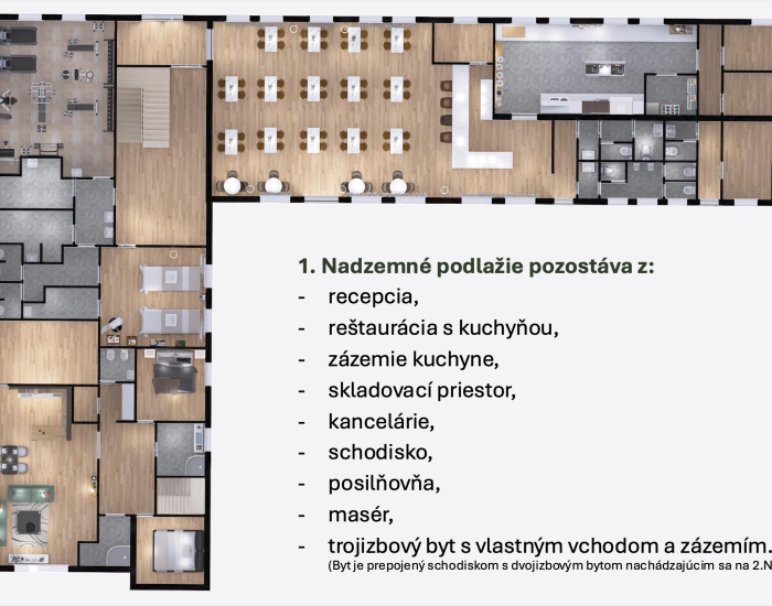 - trojizbový byt s vlastným vchodom a zázemím.(Byt je prepojený schodiskom s dvojizbovým bytom nachádzajúcim sa na 2.NP)