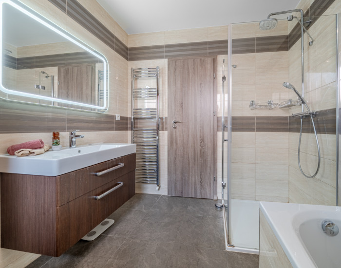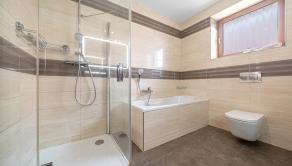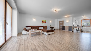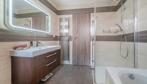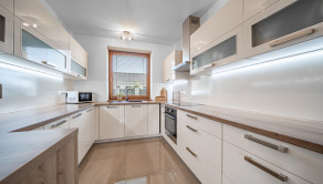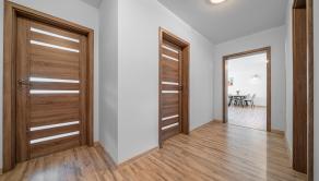 DISPOZÍCIA: Predsieň so vstavanou skriňou a vstupom do práčovne s toaletou, obývacia izba spojená s jedálňou, vstupom na terasu a kuchyňou (44m2), 3x spálňa, pracovňa, kúpeľňa s vaňou, veľkým sprchovým kútom a toaletou.