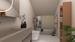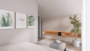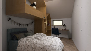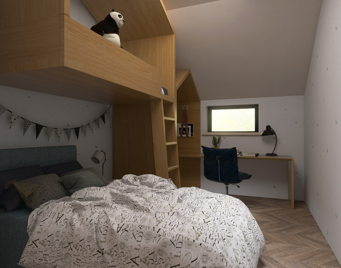 Dve samostatné detské izby – dostatok priestoru na spánok, učenie aj hranie. Veľká rodičovská spálňa s krásnym výhľadom na Tatry a súkromnou kúpeľňou s prípravou na vaňu – ideálna pre večerný oddych. Izby sú presvetlené a dobre rozmiestnené tak, aby každé dieťa malo svoj vlastný priestor. Exteriér vhodný pre deti aj rodičov