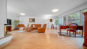 kuchyňa s výstupom na priestrannú terasu (36 m²) , špajza , jedáleň, obývacia izba s krbom a výstupom do átria s vonkajším krbom (28 m²) , ktoré v lete poskytuje príjemný tieň. Samostatná garsónka (izba, kuchynský kút, kúpeľňa so sprchovacím kútom a WC) s vlastným výstupom na terasu a možnosťou oddeleného vstupu.