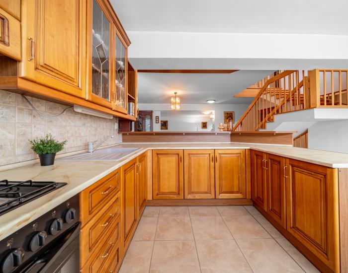 Okná sú plastové, pričom veľké presklené plochy poskytujú dostatok svetla počas celého dňa. V dome sa nachádzajú 3 kúpeľne a 4 toalety. Celková úžitková plocha je cca 508 m², rozdelená do štyroch nadzemných podlaží.