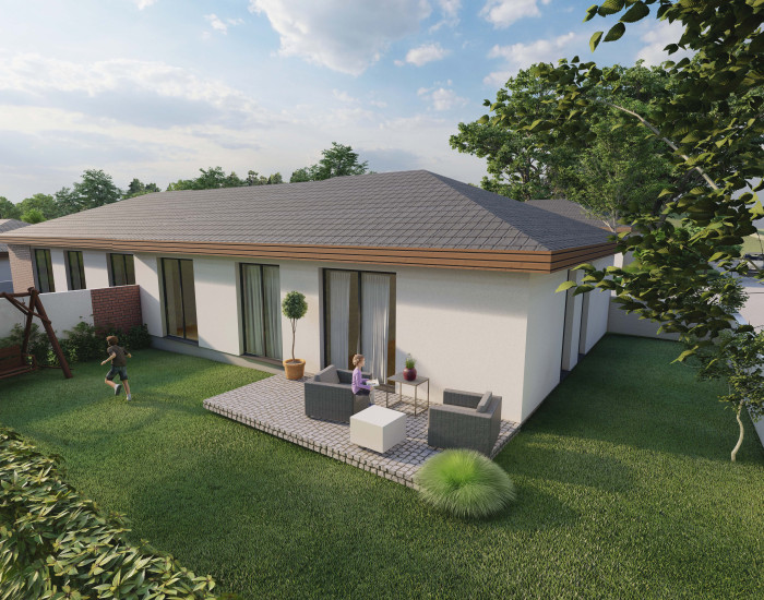 RODINNÝ DOM: v ponuke je 6 prízemných 4 izbových rodinných domov. Domy budú postavené do štádia "štandard"- vymaľované steny, osadené vypínače, zásuvky, interiérové dvere a zárubne, obklady a sanita v kúpeľniach vrátane dokončeného exteriéru - oplotenie, brána a vybudované parkovacie miesta pred domom. Farebné prevedenie štandardu je voliteľné. V cene je predpríprava na vonkajšie elektrické žalúzie, klimatizácia, alarm a fotovoltiku. Vykurovanie bude zabezpečené tepelným čerpadlom. Domy budú napojené na elektrinu, vodu, kanalizáciu a optickú sieť. Projekt je v štádiu prípravy výstavby, výstavba bude zahájená ihneď po vydaní právoplatného stavebného povolenia, predpokladaný termín zahájenia výstavby rodinných domov je začiatok roka 2026 a predpokladaný termín dokončenia je v roku 2027.
