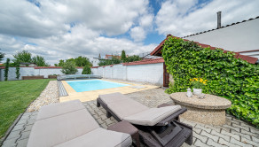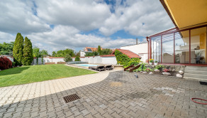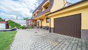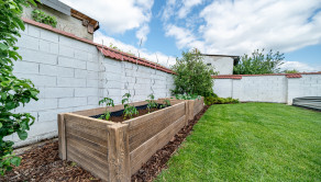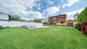 Pozemok ponúka rozlohu 700m², pričom zastavaná plocha domu je 130m². Väčšinu záhrady tvorí udržiavaný trávnik s automatickým zavlažovacím systémom. Zaujímavým prvkom záhrady je vstup do klenbenej pivnice. Absolútnou dominantou exteriéru je určite krytý bazén so slanou vodou a zimná záhrada. Parkovanie je zaistené garážou pre dva osobné automobily.