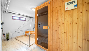 – 1. podzemné podlažie (90m²) tvorí pivnica, fitness, fínska sauna, vinná pivnica, miestnosť na náradie a nástroje, špajza