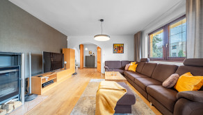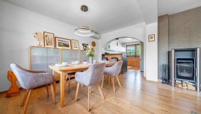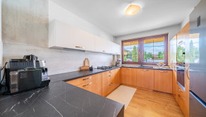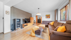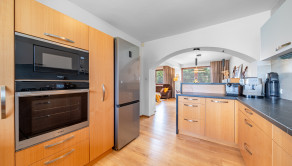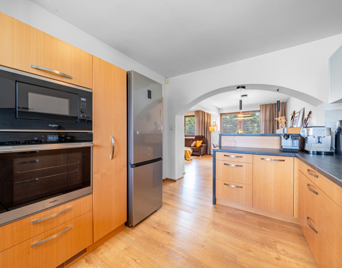 – 1. nadzemné podlažie (90m²) s hlavným vstupom, predsieň, priestranná obývacia miestnosť v tvare L spojená s jedálňou, vstup do zimnej záhrady, otvorená kuchyňa kompletne vybavená zabudovanými spotrebičmi, spojovacia chodba, kúpeľňa so sprchovacím kútom, schodisko vedúce do pivnice, schodisko vedúce na 2. nadzemné podlažie