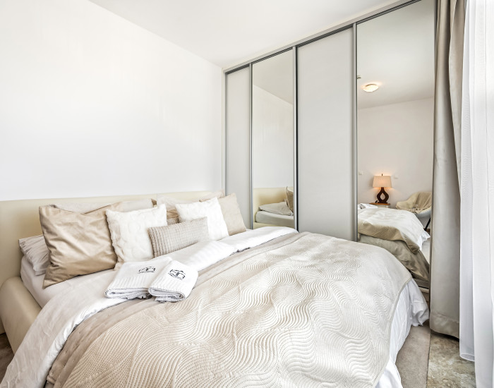 DISPOZÍCIA A ZARIADENIE: Apartmán pozostáva z dvoch samostatných miestností: Priestrannej obývacej izby spojenej s plne vybavenou kuchyňou a jedálenským kútom, kde sa nachádza aj veľká dvojlôžková posteľ. Z tejto izby je vstup na priestrannú loggiu s ratanovým sedením a nádherným výhľadom na tatranskú scenériu. Samostatnej spálne s dvojlôžkovou posteľou, vstavanou skriňou s dostatkom úložného priestoru a priamym vstupom na druhú loggiu s posedením. Apartmán disponuje samostatnou kúpeľňou s veľkým sprchovacím kútom, toaletou a umývadlom. Je kompletne zariadený kvalitným nábytkom na mieru, vrátane rozkladacieho kresla, konferenčného stolíka, vstavaných skríň a ďalších úložných priestorov. Kuchyňa je vybavená všetkými spotrebičmi – elektrická varná doska, rúra, umývačka riadu, chladnička.