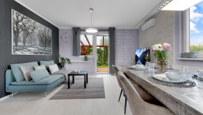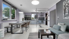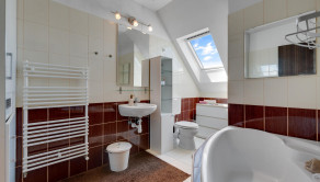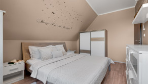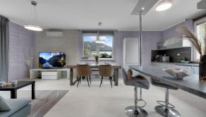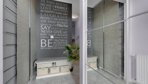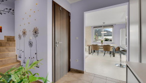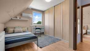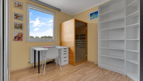 DISPOZÍCIA: Predsieň so vstavanou skriňou, veľkým úložným priestorom na topánky a vstupom do technickej miestnosti a kúpeľne so sprchovým kútom, obývacia izba spojená s kuchyňou, špajzou,vstupom na terasu, 2x spálňa, 1x pracovňa, kúpeľňa s vaňou a toaletou.