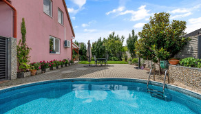 DOM: Zastavaná plocha domu je 3,3 arov z toho je úžitková plocha 99,27 m2. Moderná tehlová stavba z roku 2012 disponuje priestrannou obývačkou, ktorá je spojená s kuchyňou, tromi nepriechodnými izbami, záhradou, terasou a bazénom.