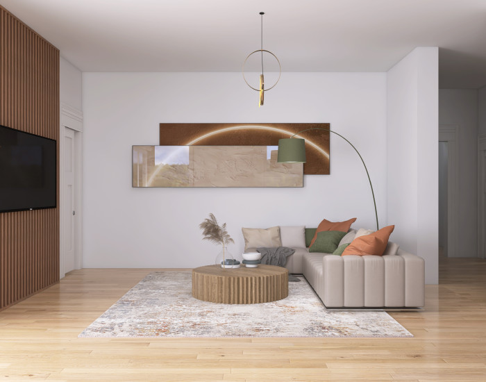 Obývacia izba s kuchyňou a spálňa sú doplnené o vizualizácie pre lepšiu predstavu využiteľnosti týchto priestorov.
