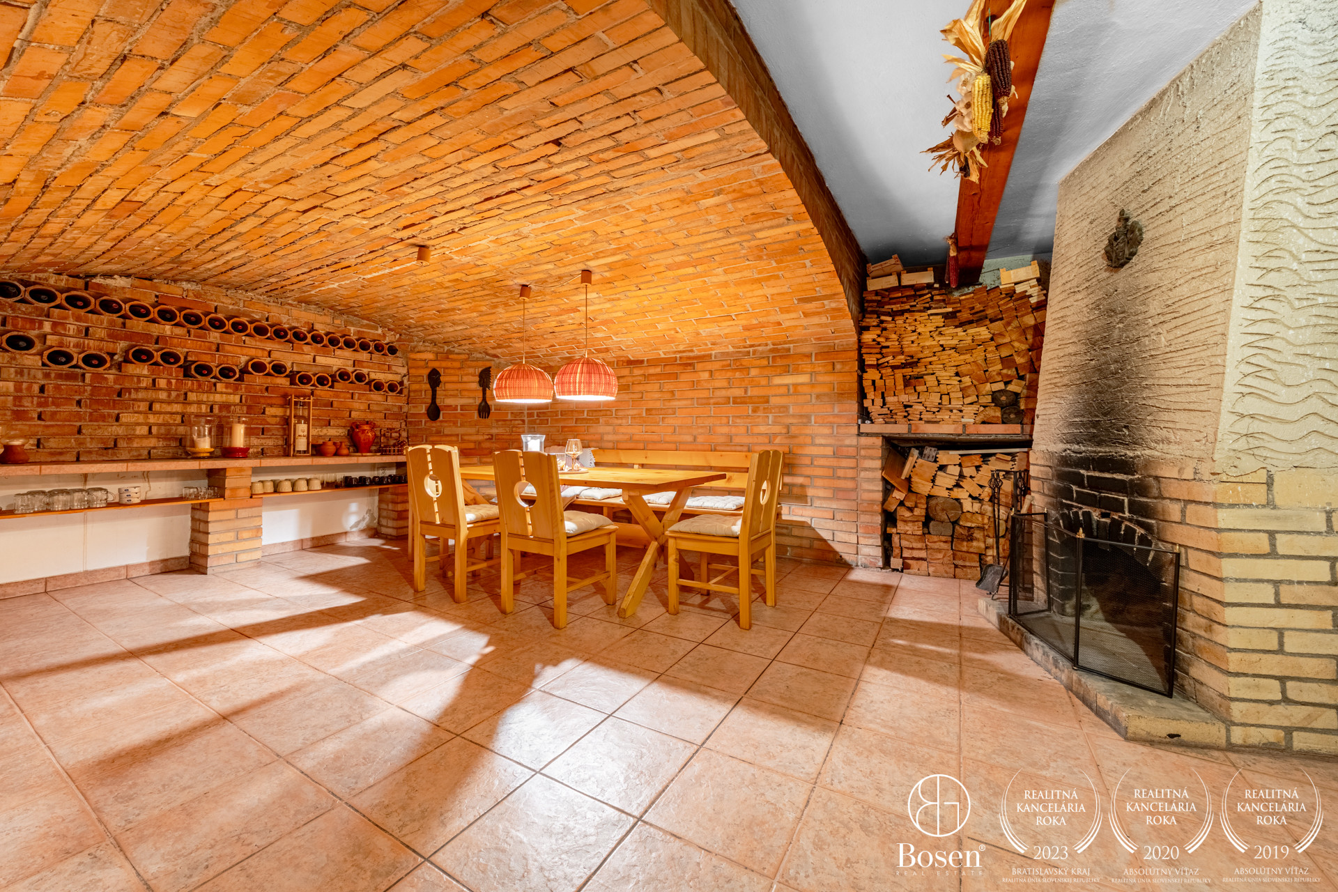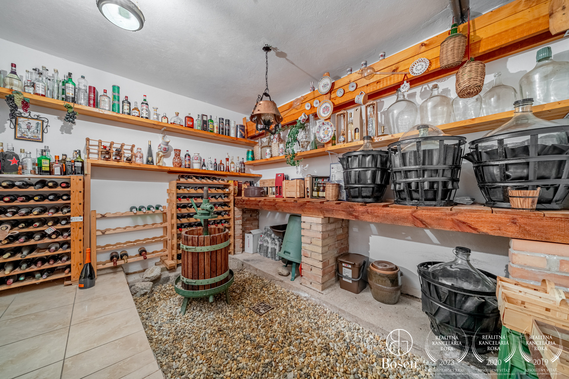 priestranná vstupná hala so šatníkom, samostatná kuchyňa so sedením, technická miestnosť, komora - ideálna na sklad zeleniny, vínna pivnica na skadovanie vína a spracovanie hrozna, priestranná klenbová degustačná pivnica s krbom – ideálna na spoločenské posedenia, praktická dielňa, garáž pre dve autá vybavená jamou na opravu áut, ako aj stropným navijakom na dvíhanie ťažších bremien, WC