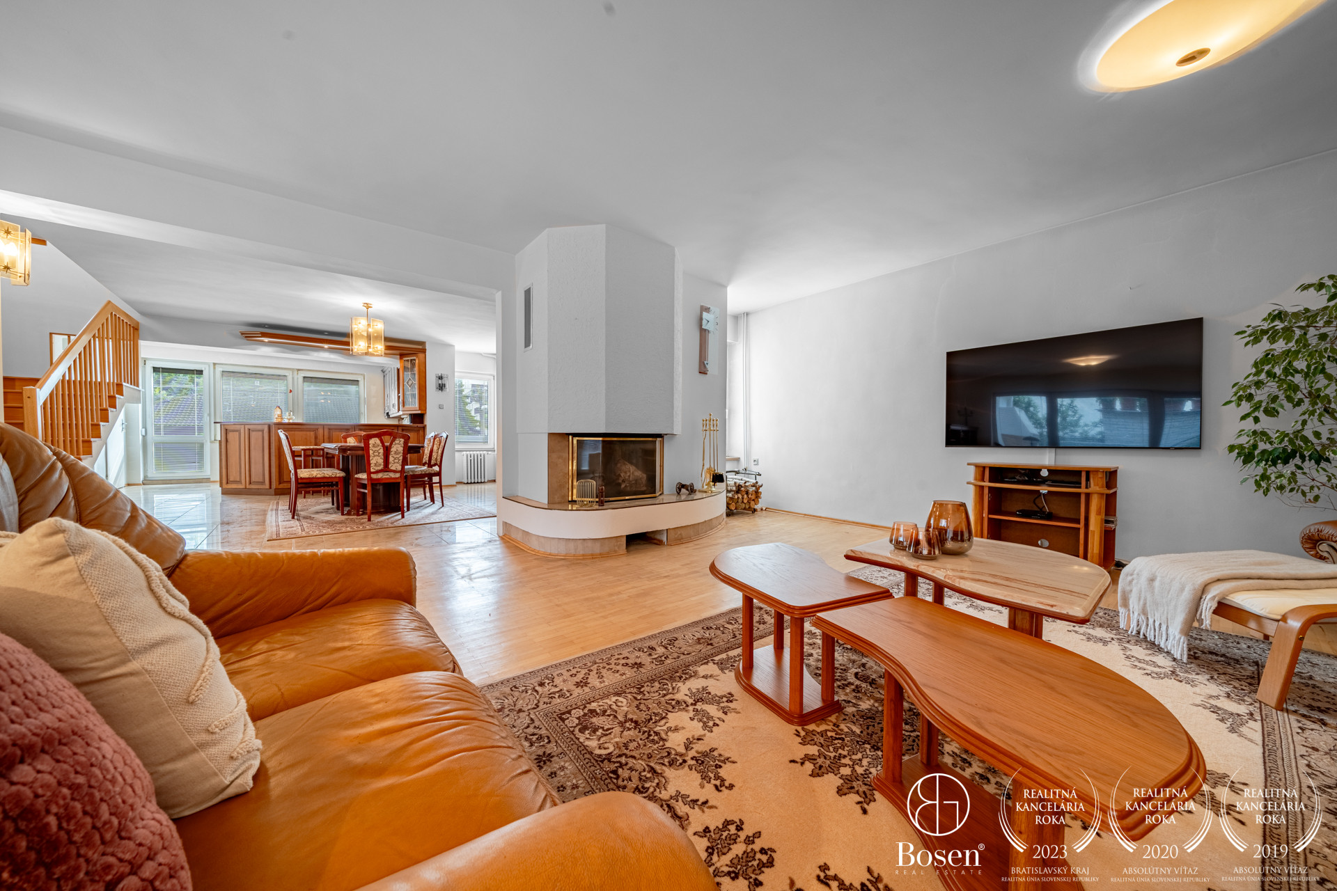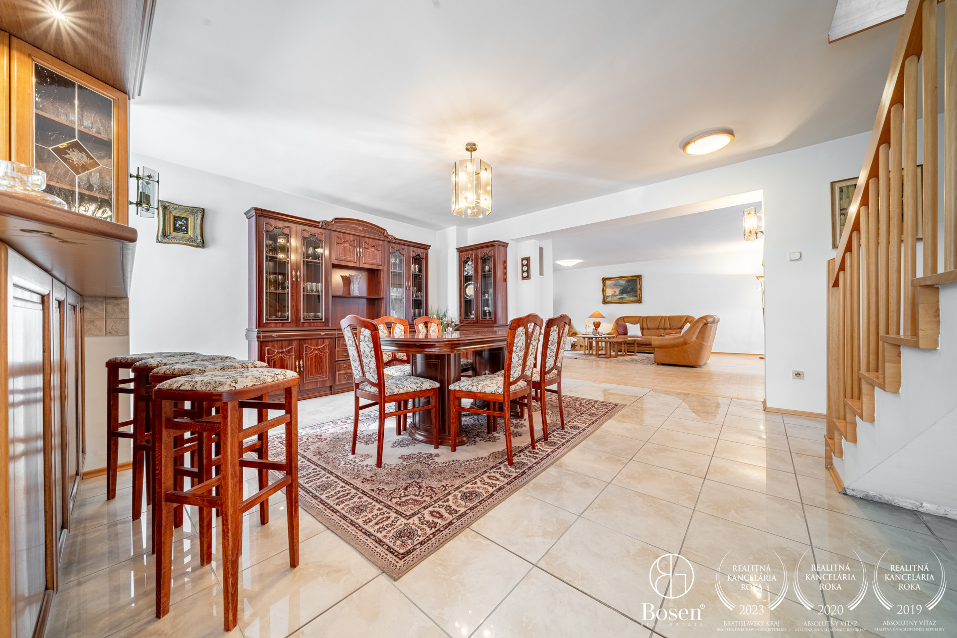 kuchyňa s výstupom na priestrannú terasu (36 m²) , špajza , jedáleň, obývacia izba s krbom a výstupom do átria s vonkajším krbom (28 m²) , ktoré v lete poskytuje príjemný tieň. Samostatná garsónka (izba, kuchynský kút, kúpeľňa so sprchovacím kútom a WC) s vlastným výstupom na terasu a možnosťou oddeleného vstupu.