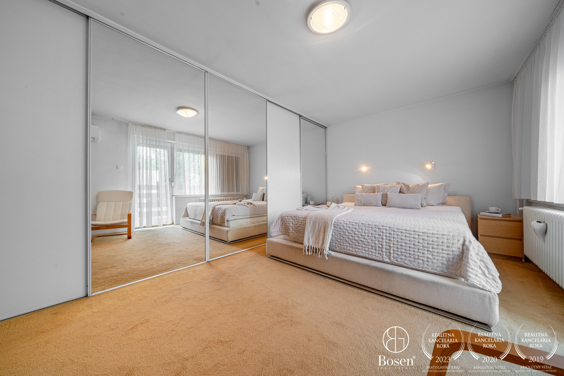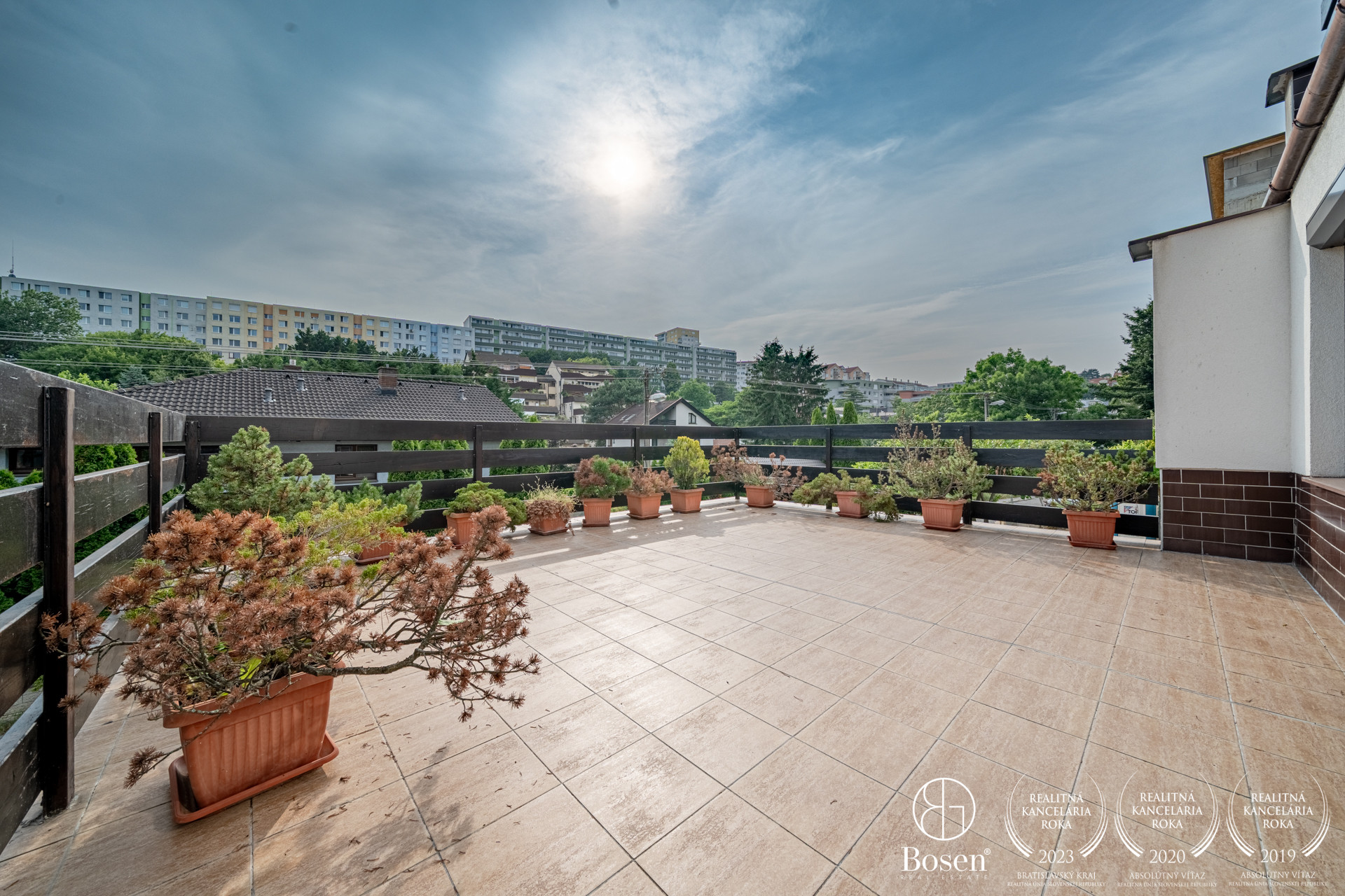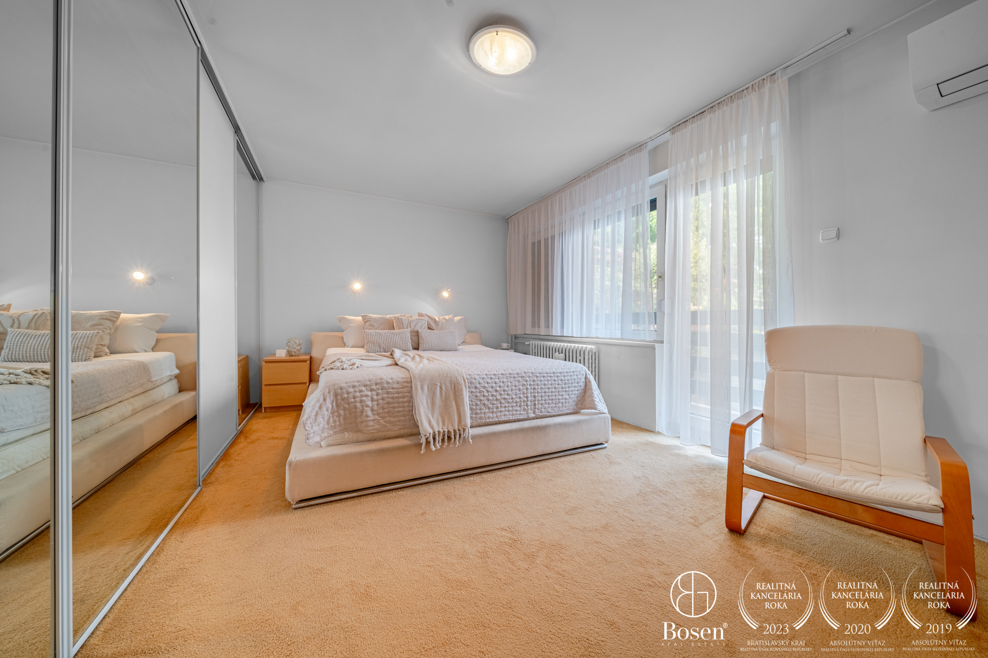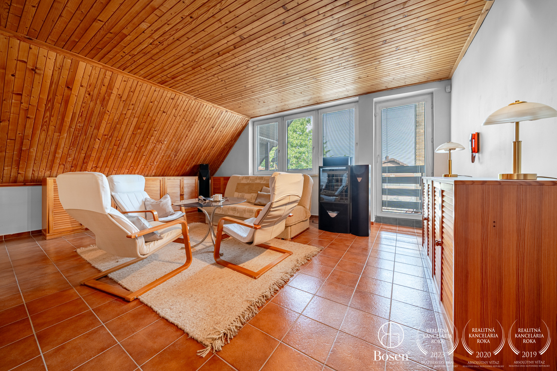 Hlavná spálňa s klimatizáciou a lodžiou, spálňa / hosťovská izba s dreveným stropom a s vlastnou terasou, priechodná izba / pracovňa s výstupom na zadný dvor, kúpeľňa s vaňou, práčovňa, samostatné WC