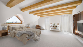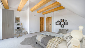 DOM: nachádza sa na pozemku 1035 m2 .Na prízemí disponuje vstupnou chodbou, kuchyňou prepojenou s jedálňou a obývačkou, tento priestor dopĺňa mohutný krb, tiež hosťovská izba so samstatnou kúpeľňou, WC, práčovňa. Na poschodí priestranná chodba kde je priestor na vytvorenie oddychovej zóny, 3 spálne každá s vlastnou kúpeľňou a WC a 3 úložne priestory na chodbe.