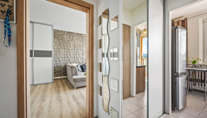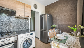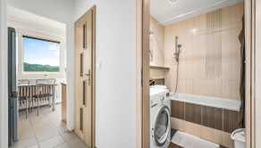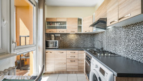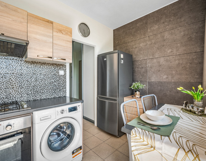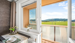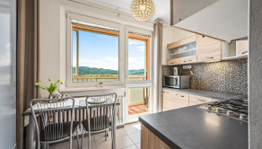 - kuchyňa kompletne zariadená spotrebičmi (chladnička, mikrovlnná rúra, elektrická rúra, plynový sporák) + jedálenský stôl a výstup na balkón s krásnym južným výhľadom na polia a lesy