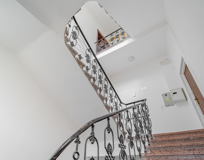 BYT: Celková výmera bytu je 116 m2 z čoho pivničná kobka tvorí 10 m2. Byt sa nachádza na 2./ 3. poschodí historického bytového domu. Má dve samostatné izby orientované do vnútrobloku a priestrannú obývaciu izbu s výhľadom do "Prezidentskej" Grasalkovičovej záhrady.