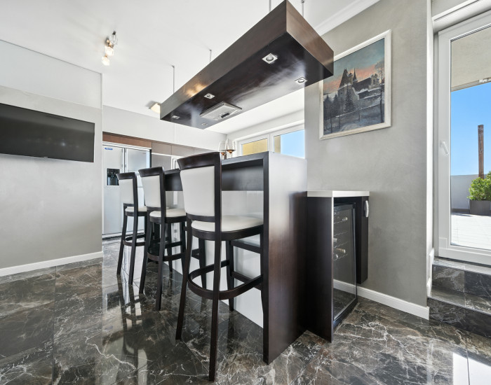 The apartment is located on the top, fifth floor of a residential building with an elevator. The entrance hall offers plenty of storage space and leads into a spacious living room connected to the kitchen and dining area. The kitchen is equipped with appliances and a practical pantry. The living area has direct access to both terraces. The apartment features a master bedroom and two separate rooms, which can be used as children's rooms, an office, or guest rooms. There are two bathrooms – the first is equipped with a bathtub, shower, toilet, and space for a washing machine and dryer; the second bathroom has a shower and toilet. There is also a balcony accessible from the night area. The comfort of living is enhanced by underfloor heating, air conditioning, exterior blinds, and a dominant fireplace that creates a pleasant atmosphere. In 2025, the flooring in the apartment was replaced. The apartment also includes a cellar.