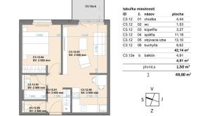 BYT: Celková podlahová plocha bytu je 42,14 m² + balkón 4,91 m². Nachádza sa na 3. poschodí novostavby. K bytu prislúcha pivnica a parkovacie státie priamo v areáli.