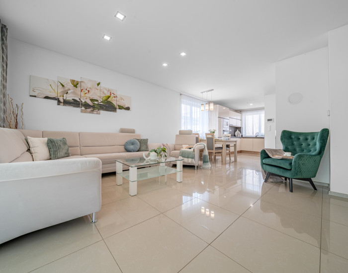 RODINNÝ DOM: pozostáva zo vstupnej chodby, samostatného WC, 2 spální, šatníka, kúpeľne, technickej miestnosti a kuchyne prepojenej s obývačkou, z ktorej je východ na dvor a prestrešenú terasu. Úžitková plocha domu je 85m2. Celý interiér domu je ladený do neutrálnych farieb. Vykurovanie je zabezpečené plynovým kotlom. Povala je pochôdzna a slúži ako odkladací priestor. Dom je napojený na alarm. Nehnuteľnosť sa predáva čiastočne zariadená.