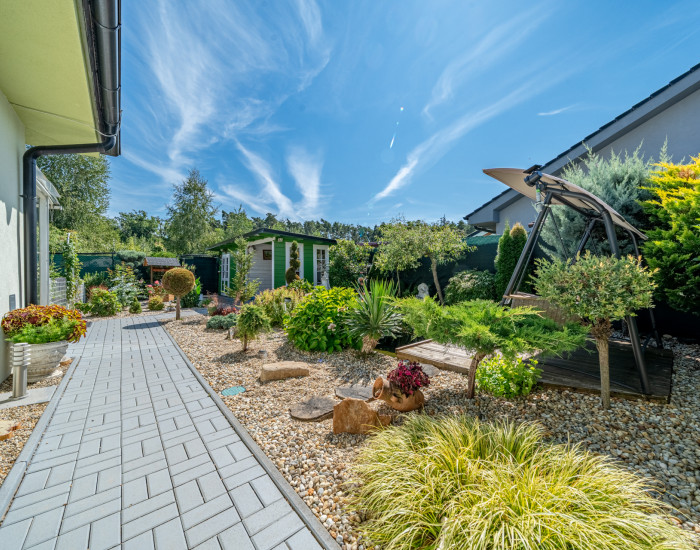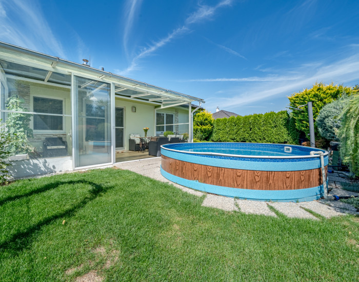 POZEMOK: výmera pozemku je 429m2, pozemok sa dá predĺžiť prikúpením ďalšieho pozemku. Terasa je prestrešená, na pozemku sa nachádza aj záhradný domček, studňa 9m hlboká (polievanie záhrady) a bazén. Na pozemku je možné parkovať 2 autá pod prístreškom. Celý pozemok je udržiavaný, tvorí ho nádherná okrasná záhradka s rybníčkom.