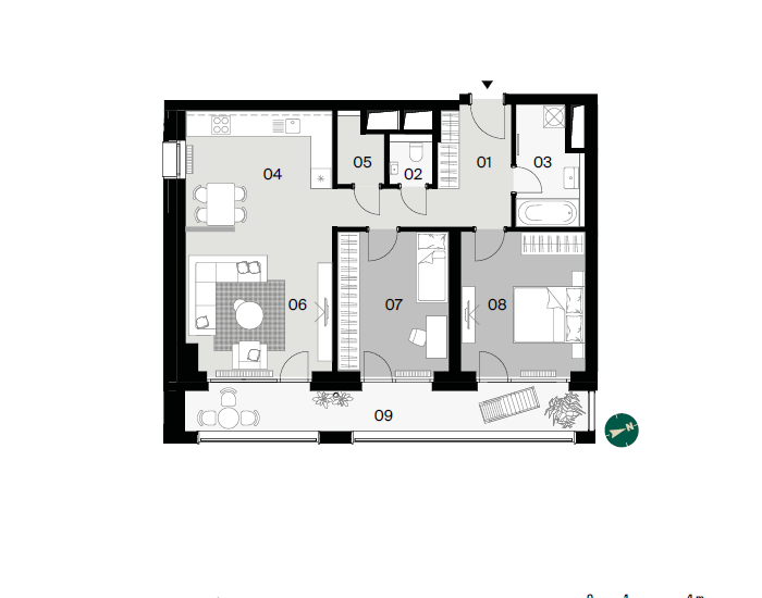 BYT: Byt má celkovú úžitkovú plochu 78,72m² a prislúcha k nemu balkón o veľkosti 13,63m². Nachádza sa na 3. poschodí. K bytu je možné dokúpiť dve garážové státia v podzemnej garáži a kobku. Efektívna dispozícia bez nevyužitých priestorov a chodieb. Hlavný vstup vedie do predsiene, z ktorej je pohodlný prístup do všetkých častí bytu. Po ľavej strane sa nachádza kúpeľňa vybavená vaňou a sprchovým kútom, zatiaľ čo po pravej strane je samostatné WC. Z predsiene je vstup do dvoch samostatných izieb – spálne a druhej izby vhodnej ako detská izba, pracovňa alebo hosťovská izba. Obývacia izba je prepojená s kuchyňou v modernom otvorenom priestore, pričom je tam aj praktická špajza. Zo všetkých obytných miestností vrátane obývacej izby je prístup na balkón, ktorý prináša dostatok denného svetla a je situovaný do tichého vnútrobloku.