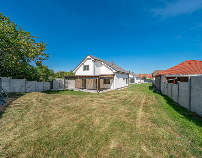 RODINNÝ DOM: Úžitková plocha tohto luxusného rodinného domu je 152 m2, má veľkú terasu veľkosti 45 m2 a 5 izieb. Pri výstavbe boli použité kvalitné materiály, konštrukcia je tehlová. Súčasťou domu sú plastové okná s izolačným trojsklom, elektrické vonkajšie žalúzie v celom dome a elektrické zatienenie terasy. Súčasťou smart vybavenia je ovládanie cez aplikáciu, a to: alarm, klimatizácia, osvetlenie, závlaha, kúrenie.