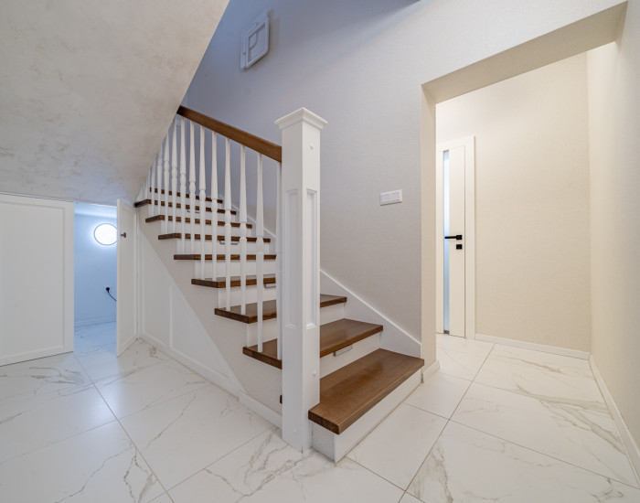 DISPOZÍCIA: Vchod do domu, vstupná chodba (vybavená veľkými šatňíkovími skriňami), z ktorej je prístup na prízemie, kde je kuchyňa so spotrebičmi v nadštandardnej kvalite, obývačka s jedálňou so vstupom na priestrannú terasu, sprchový kút s toaletou, šatník a miestnosť na sušenie prádla. Schody z kvalitného dreva sa dostaneme na vrchné poschodie, kde sa nachádzajú 3 spálne, šatník, kúpeľňa s vaňou a samostatná toaleta.