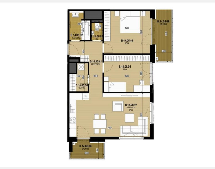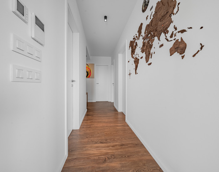 DISPOZÍCIA: Byt pozostáva zo vstupnej chodby s úložným priestorom, a je z nej vstup do kúpeľne a samostatnej toalety. Nasleduje hlavná spálňa s výstupom na balkón s výhľadom na Staré Mesto. Z chodby je ďalej vstup do pracovne/detskej izby, ako aj do šatníka s práčovňou. Obývacia izba je prepojená s kuchyňou a jedálenskou časťou a je z nej výstup na druhý balkón.