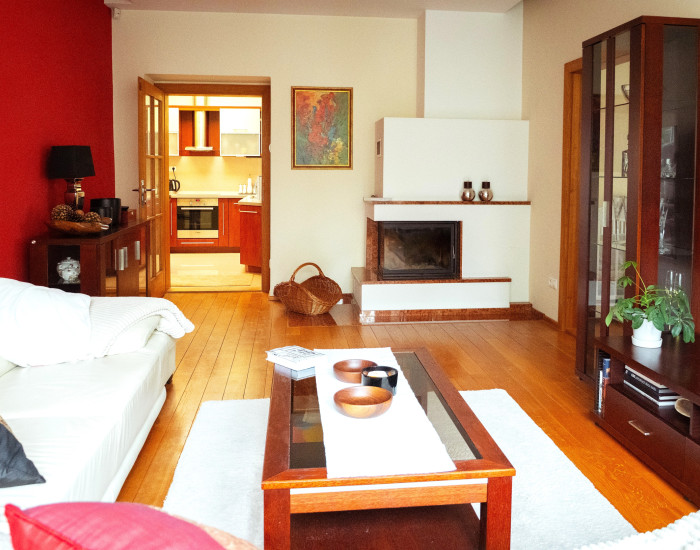Interiér spája nadčasovú estetiku s funkčným dizajnom. Dominantou dennej časti je priestranná obývacia izba s krbom, ktorý vytvára neopakovateľné teplo domova. Byt sa predáva kompletne zariadený, čo vám umožní okamžité nasťahovanie bez ďalších investícií.
