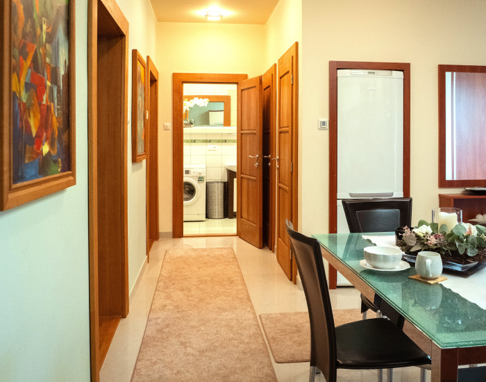 Interiér spája nadčasovú estetiku s funkčným dizajnom. Dominantou dennej časti je priestranná obývacia izba s krbom, ktorý vytvára neopakovateľné teplo domova. Byt sa predáva kompletne zariadený, čo vám umožní okamžité nasťahovanie bez ďalších investícií.