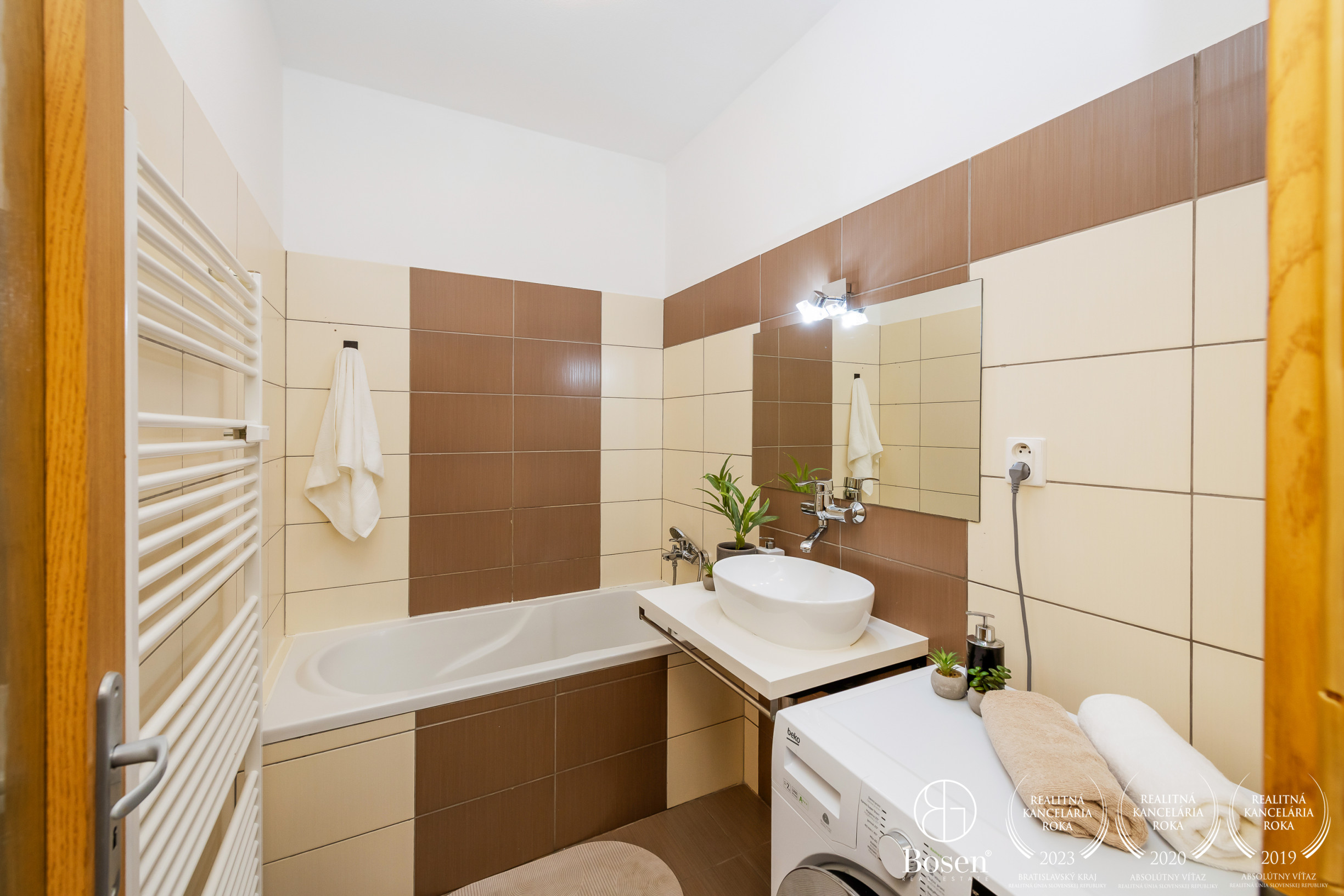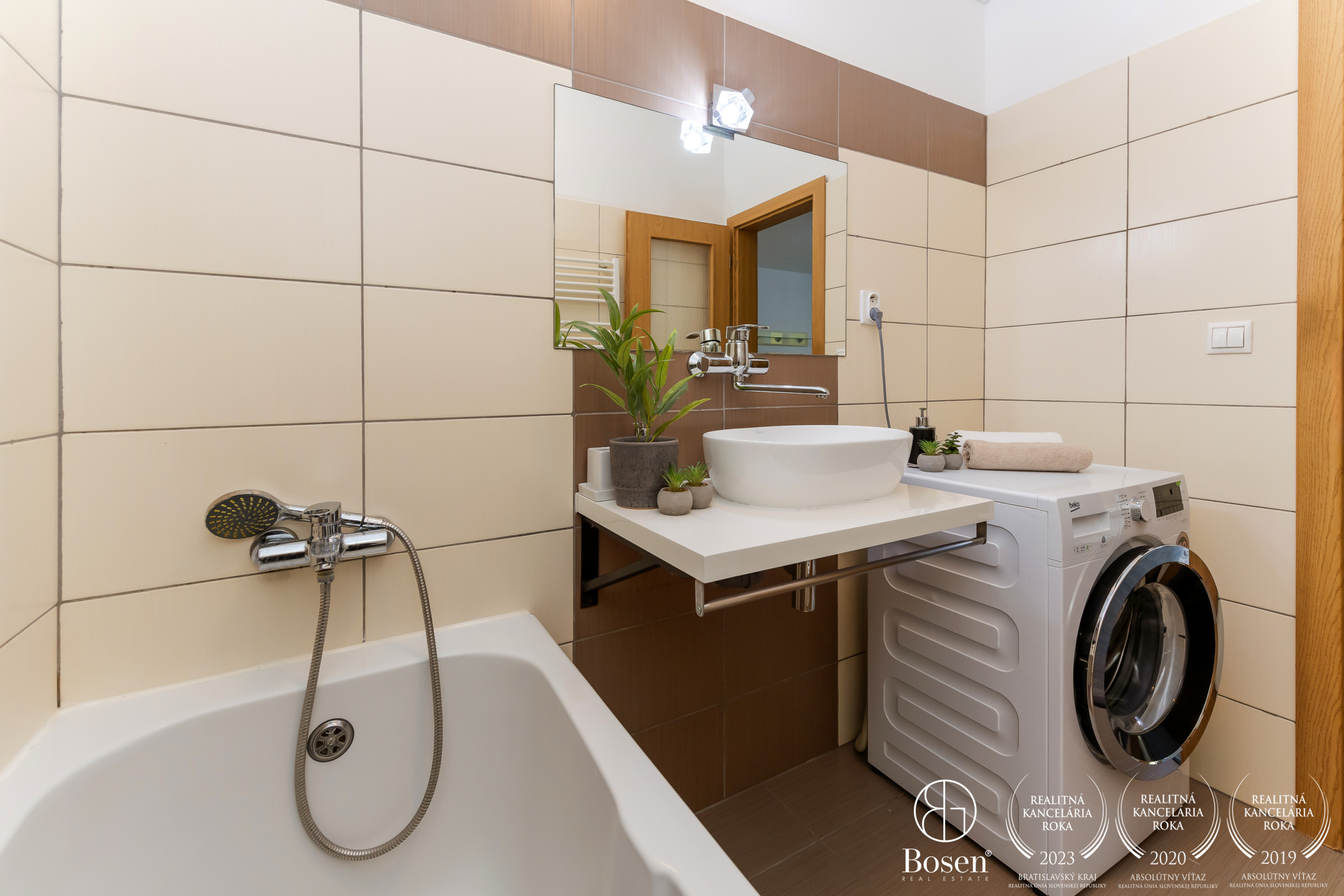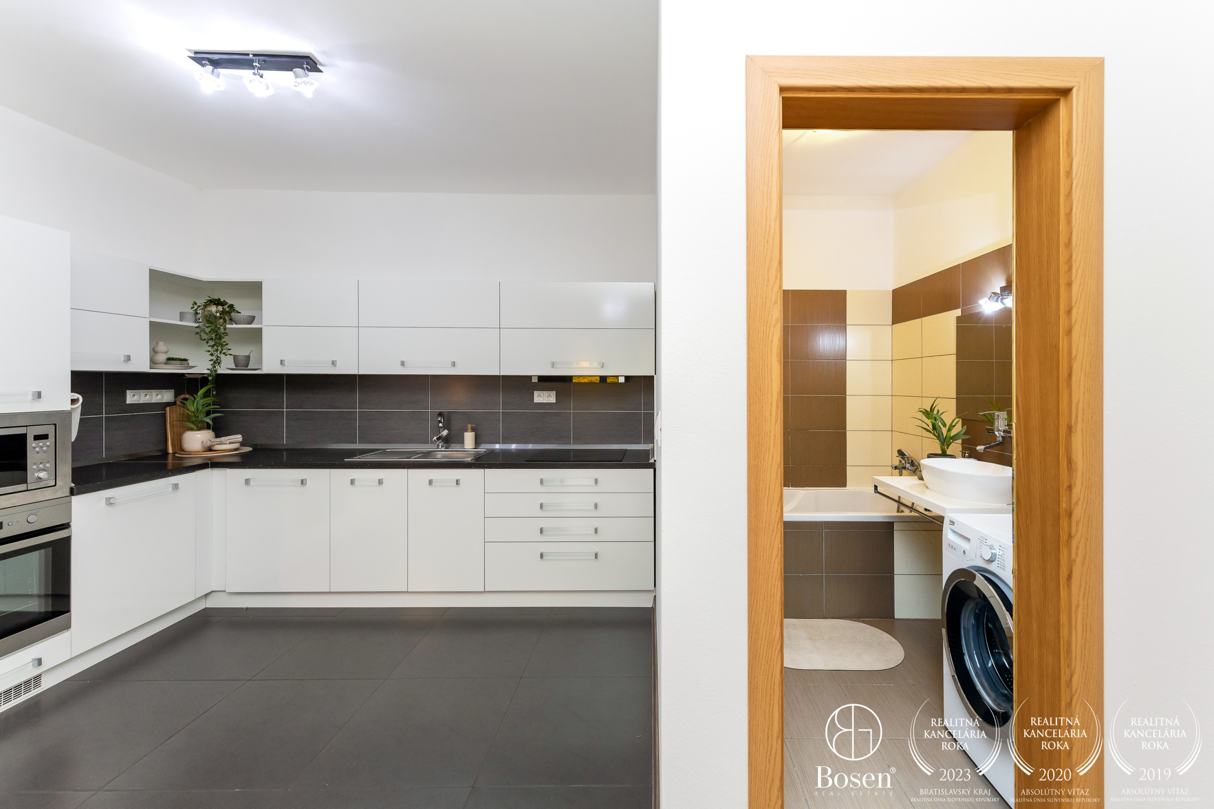 VYBAVENIE: Byt sa predáva kompletne zariadený a je okamžite pripravený na nasťahovanie. V interiéri nájdete modernú kuchynskú linku so spotrebičmi, pohodlnú obývaciu časť, priestrannú spálňu a kúpeľňu so sanitou a práčkou. Všetky miestnosti sú svetlé a vzdušné, čo podčiarkuje jeho príjemnú orientáciu a moderný charakter. Celkové mesačné náklady pre dve osoby sú 185,- Eur.
