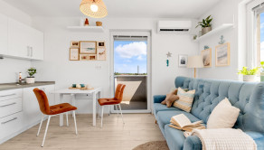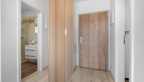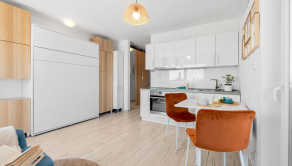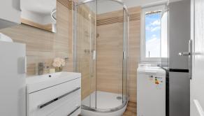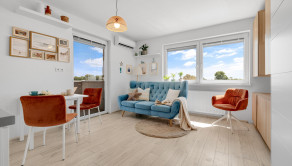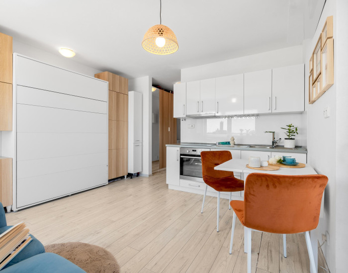 ZARIADENIE: Byt sa predáva zariadený. Vo vstupnej chodbe je umiestnená priestranná skriňa, vešiaková stena a botník. Obývaciu izbu s jedálenskou časťou tvorí sklápacia manželská posteľ Bed concept 1, skrine, jedálenský stôl, police a klimatizácia. V kuchyni sa nachádza kuchynská linka s elektrickou varnou doskou a vstavanou elektrickou rúrou. Kúpeľňa disponuje sprchovým kútom, umývadlom a práčkou. V kúpelni je tiež umiestnená chladnička s mrazničkou.