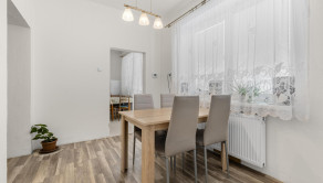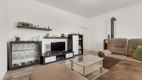 DISPOZÍCIA: vstupná chodba, jedáleň, kuchyňa, 2 prechodné izby, obývačka, kúpeľňa so sprchovým kútom, samostatné WC. Vstup na terasu je z kuchyne. Dom je čiastočne podpivničený.