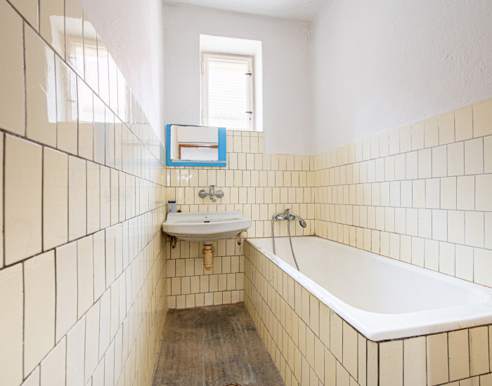 DISPOZÍCIA: Dom má dva vstupy – jeden z ulice a druhý z dvora. Zo vstupnej chodby sa prechádza do hlavnej chodby, z ktorej vedú vstupy do kuchyne, obývacej izby, spálne, komory, WC, obývacej izby č. 1, obývacej izby č. 2 a vedľa kúpeľne je schodisko vedúce na druhé podlažie domu, kde sa nachádza jedna izba a podkrovie.