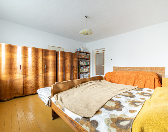 DISPOZÍCIA: Dom má dva vstupy – jeden z ulice a druhý z dvora. Zo vstupnej chodby sa prechádza do hlavnej chodby, z ktorej vedú vstupy do kuchyne, obývacej izby, spálne, komory, WC, obývacej izby č. 1, obývacej izby č. 2 a vedľa kúpeľne je schodisko vedúce na druhé podlažie domu, kde sa nachádza jedna izba a podkrovie.