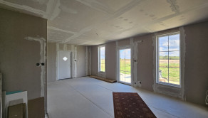 Jedna časť domu je dokončená do stavu holodom, druhá je obývateľná ihneď. Dom je svetlý vďaka veľkým oknám s izolačným dvojsklom.