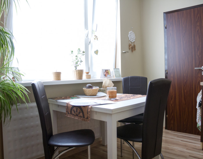 Zo vstupnej chodby je prístup do kúpeľne a samostatného WC. Ďalej sa dostaneme do troch izieb – priestrannej obývačky s výstupom na balkón, veľkej izby vhodnej ako spálňa či detská izba a ďalšej samostatnej izby. Z chodby vedie vstup do kuchyne a štvrtej izby.