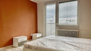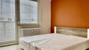 Obývacia izba je spojená so spálňou, ktorá disponuje manželskou posteľou, obývacou stenou a skriňou na oblečenie.