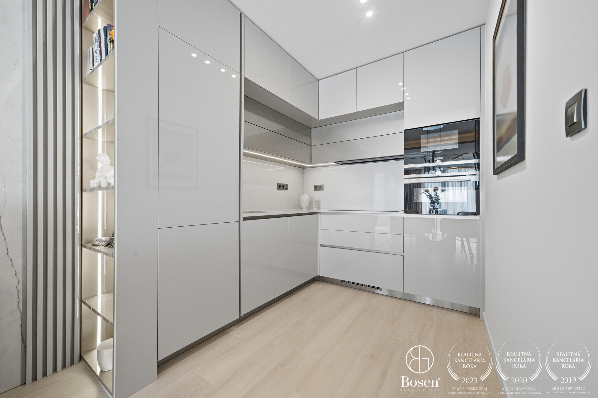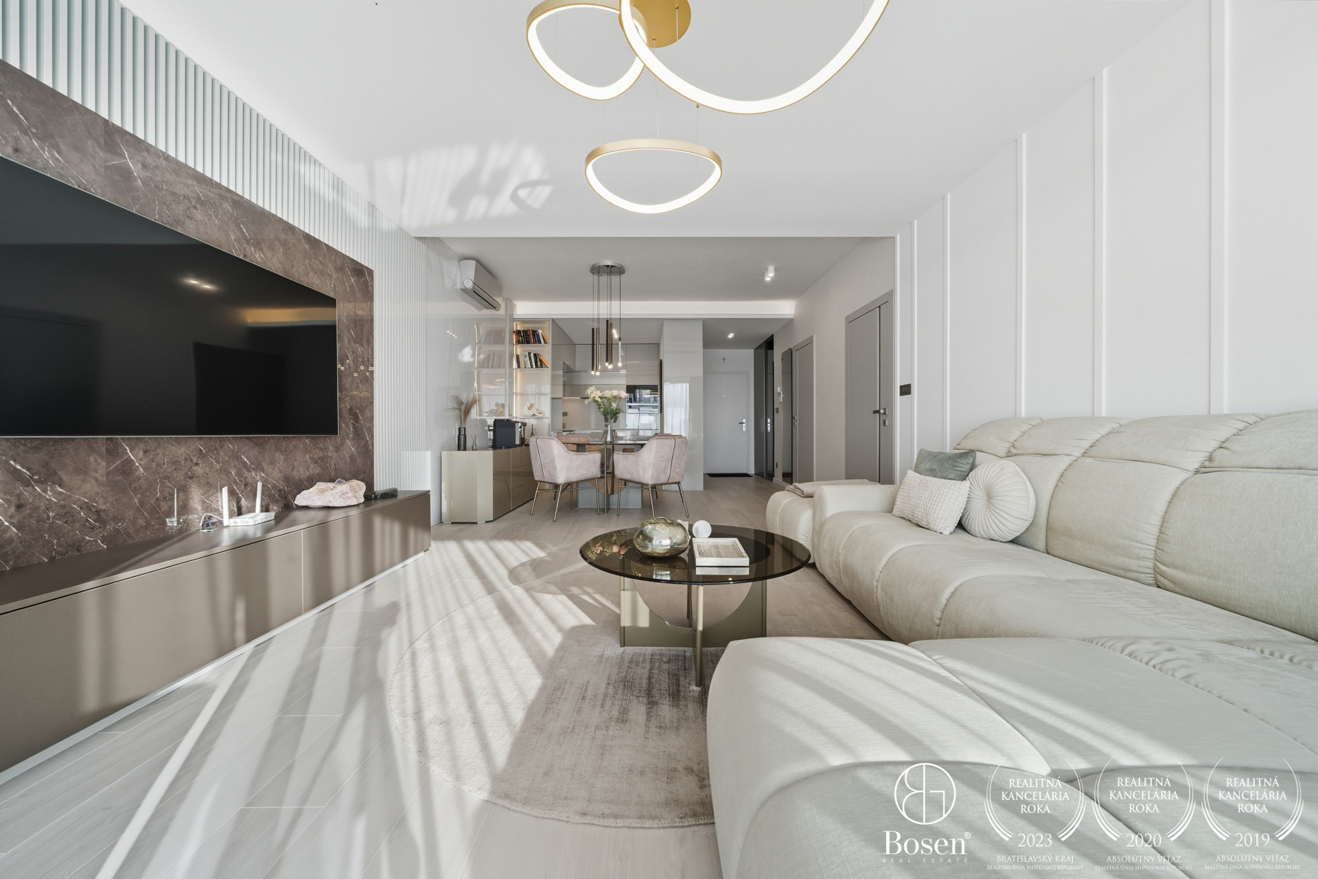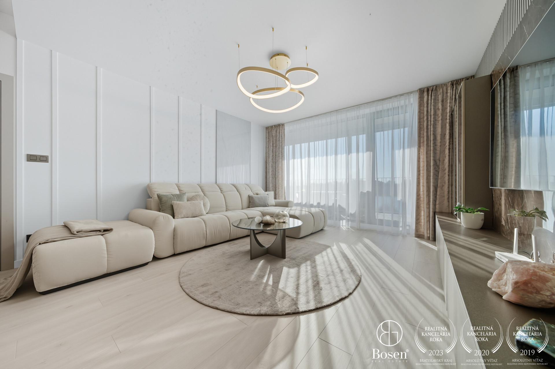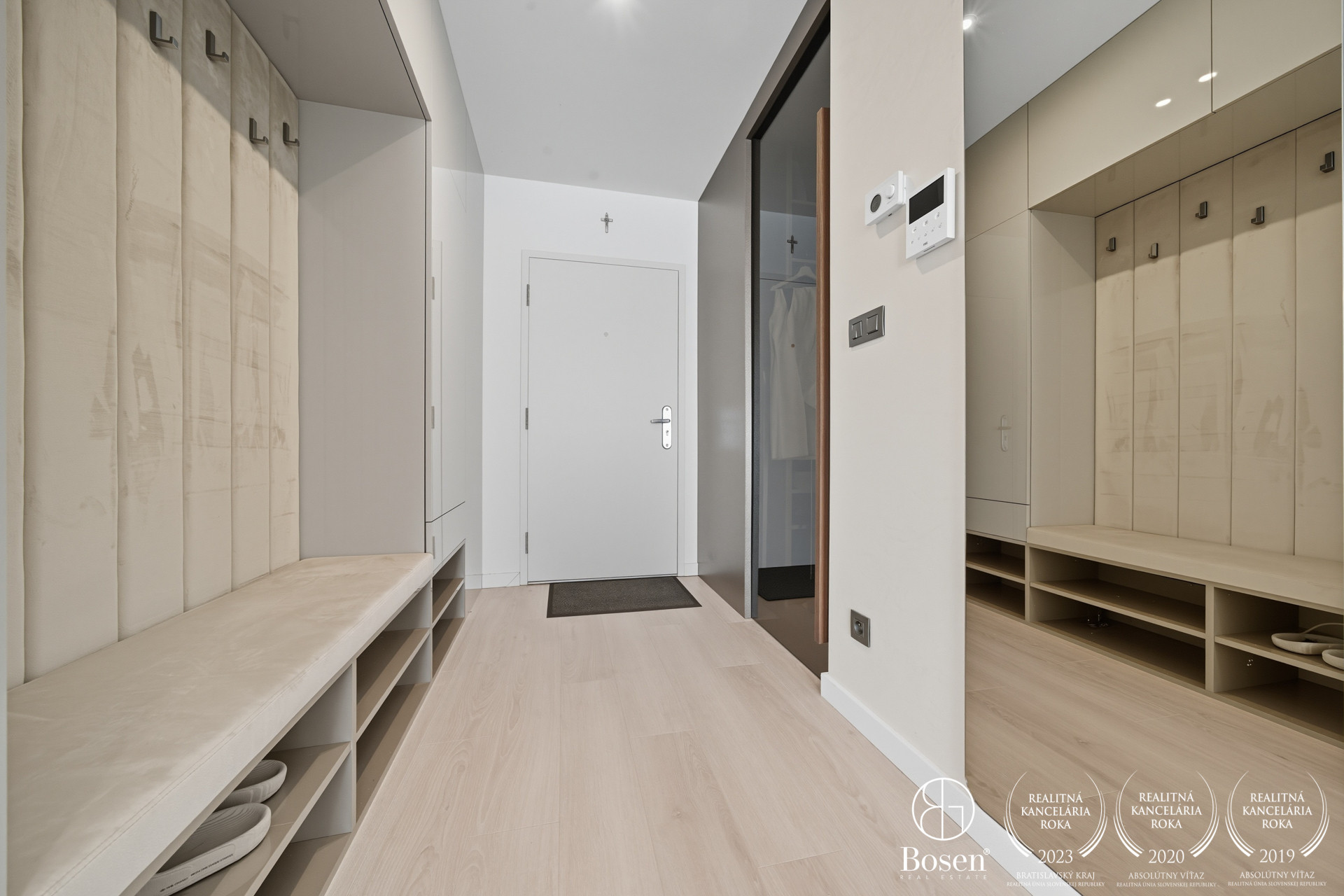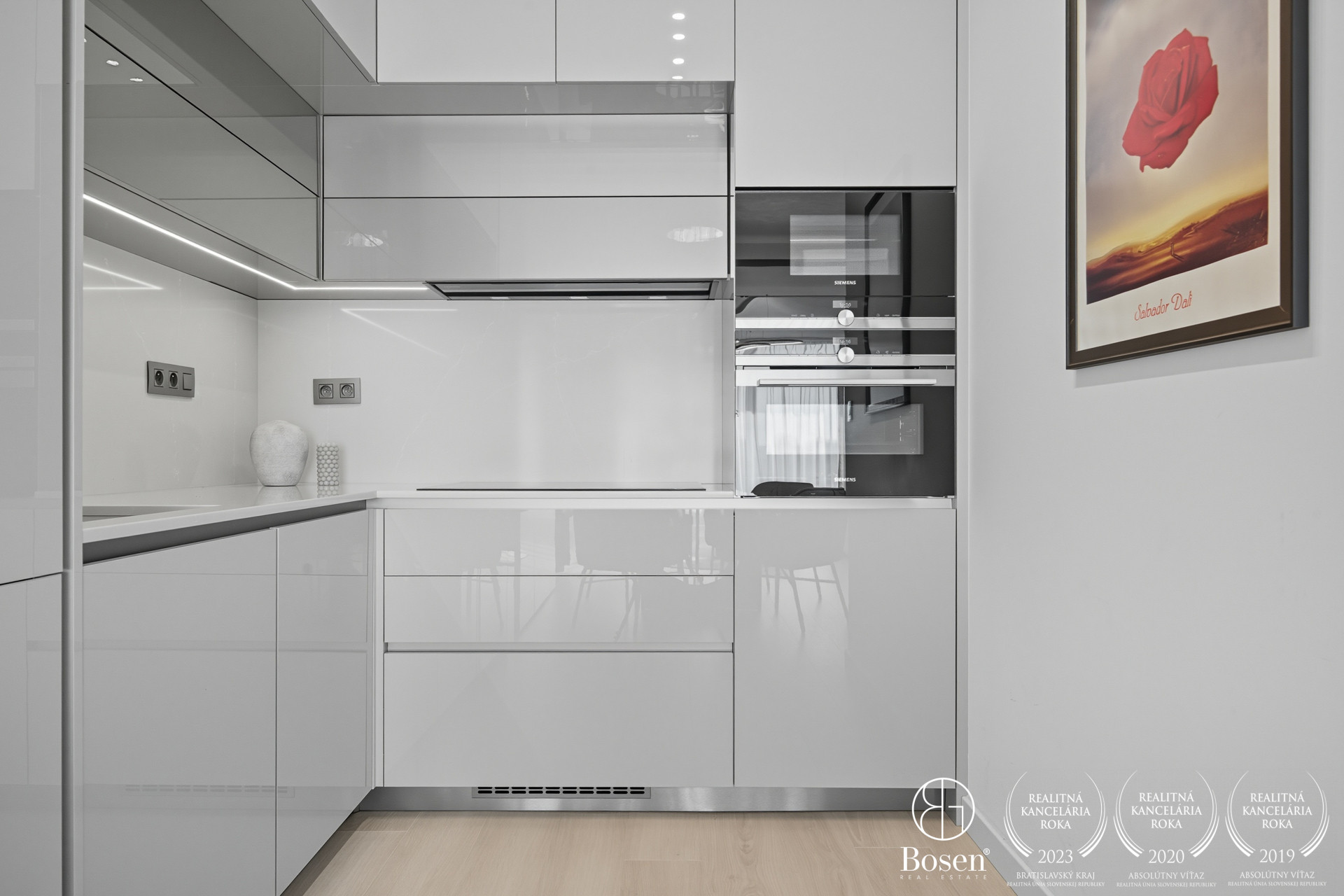 VYBAVENIE: Byt je vybavený bezpečnostnými vchodovými dverami, hliníkovými oknami a balkónovými dverami s izolačným trojsklom a exteriérovými žalúziami aj balkónovým tienením. Obytné miestnosti majú kvalitné laminátové podlahy, terasy a balkóny sú pokryté keramickou mrazuvzdornou dlažbou a betónovými dlaždicami. Kuchyňa je plne zariadená značkovými spotrebičmi a kúpeľne sú vybavené keramickou dlažbou a kvalitnou sanitou. Byt je kompletne klimatizovaný. Objekt má centrálnu kotolňu a podlahové vykurovanie. Každý byt má prístup k optickému internetu ako aj k spoločnému exteriérovému bazénu.