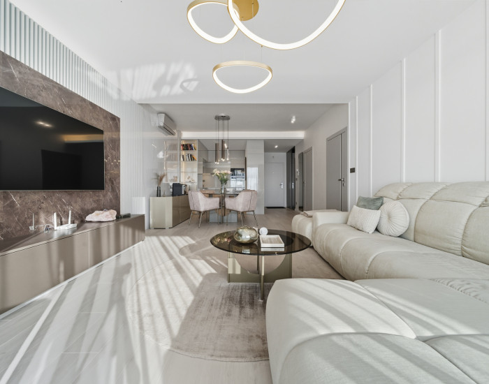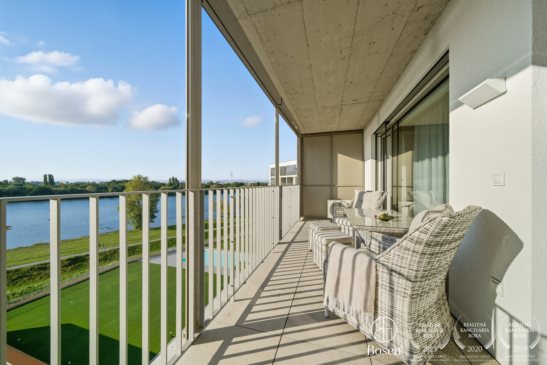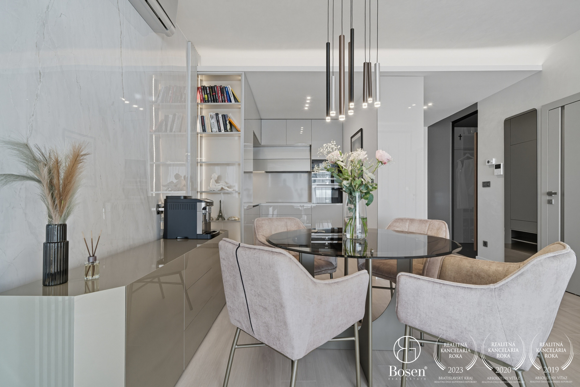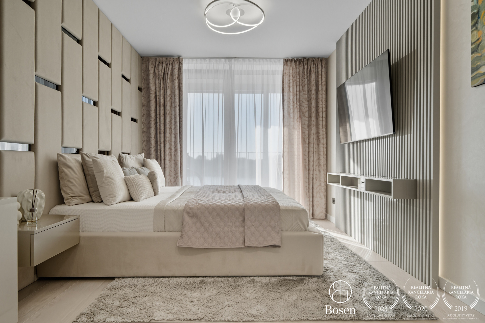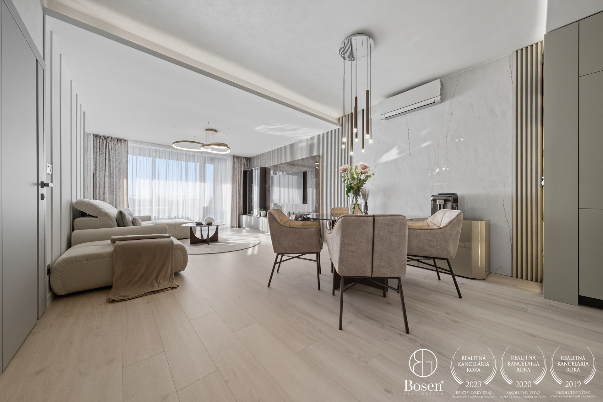 VYBAVENIE: Byt je vybavený bezpečnostnými vchodovými dverami, hliníkovými oknami a balkónovými dverami s izolačným trojsklom a exteriérovými žalúziami aj balkónovým tienením. Obytné miestnosti majú kvalitné laminátové podlahy, terasy a balkóny sú pokryté keramickou mrazuvzdornou dlažbou a betónovými dlaždicami. Kuchyňa je plne zariadená značkovými spotrebičmi a kúpeľne sú vybavené keramickou dlažbou a kvalitnou sanitou. Byt je kompletne klimatizovaný. Objekt má centrálnu kotolňu a podlahové vykurovanie. Každý byt má prístup k optickému internetu ako aj k spoločnému exteriérovému bazénu.