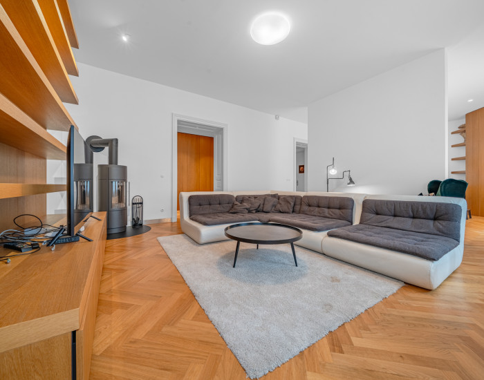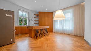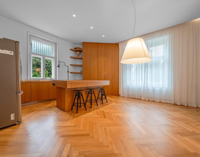 Zachované pôvodné drevené parkety, vysoké stropy a remeselné detaily dotvárajú autentický charakter interiéru, ktorý je doplnený o moderné prvky pre nadčasový a komfortný štandard bývania.