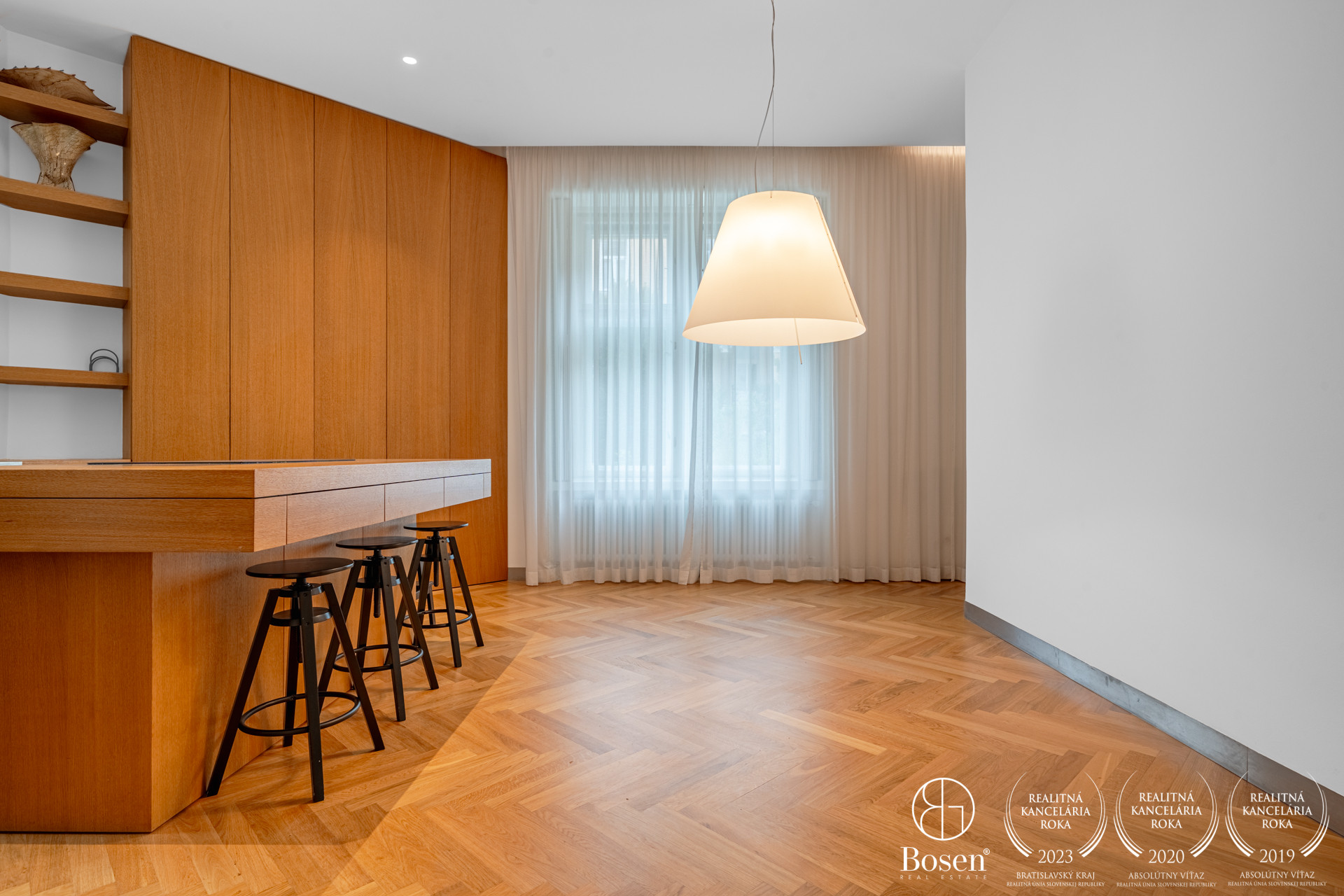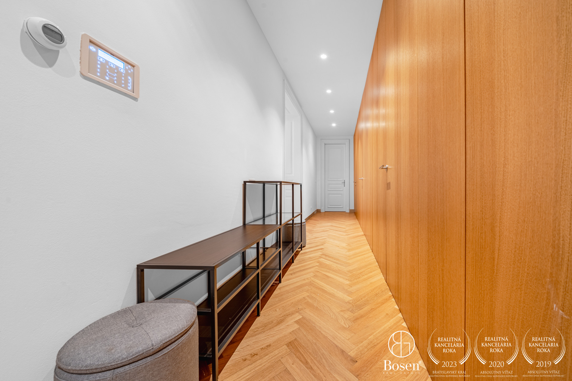 DISPOZÍCIA: Byt je premyslene rozdelený na dennú a nočnú časť. Dennú zónu tvorí otvorený priestor s kuchyňou, jedálenskou časťou a obývacou izbou s krbom, z ktorej sa vstupuje do hlavnej spálne so súkromnou kúpeľňou a vstavaným šatníkom. Zo vstupnej chodby sú prístupné ďalšie tri izby, využiteľné ako detské izby, pracovňa alebo hosťovské priestory. Súčasťou bytu je druhá kúpeľňa, samostatná toaleta, technická miestnosť a priestranná vstupná chodba, ktorá efektne prepája všetky časti interiéru.