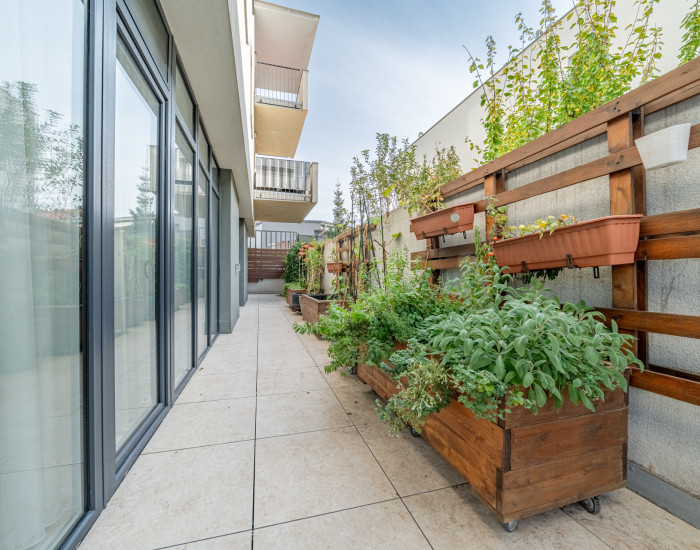 Krytá terasa so záhradným sedením. Vyvýšené záhony, okrasné stromy a rastliny. Nová dlažba s priestorom na relax. Priestor je monitorovaný kamerovým systémom.