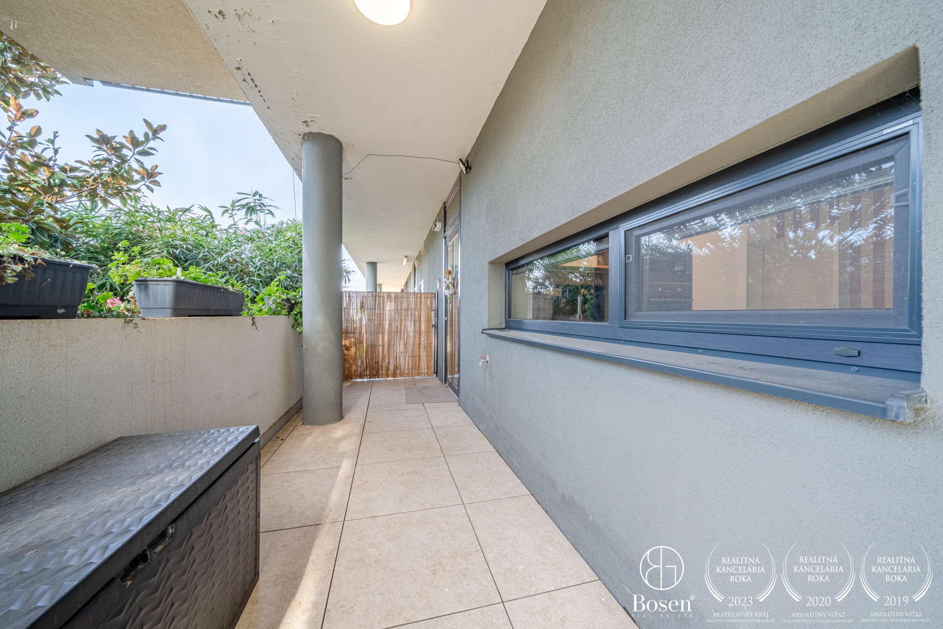 Typ: 3-izbový byt + veľká terasa + záhrada (rohový, vyvýšené prízemie), samostatný vchod len pre tento byt s uzamykateľnou bránou.