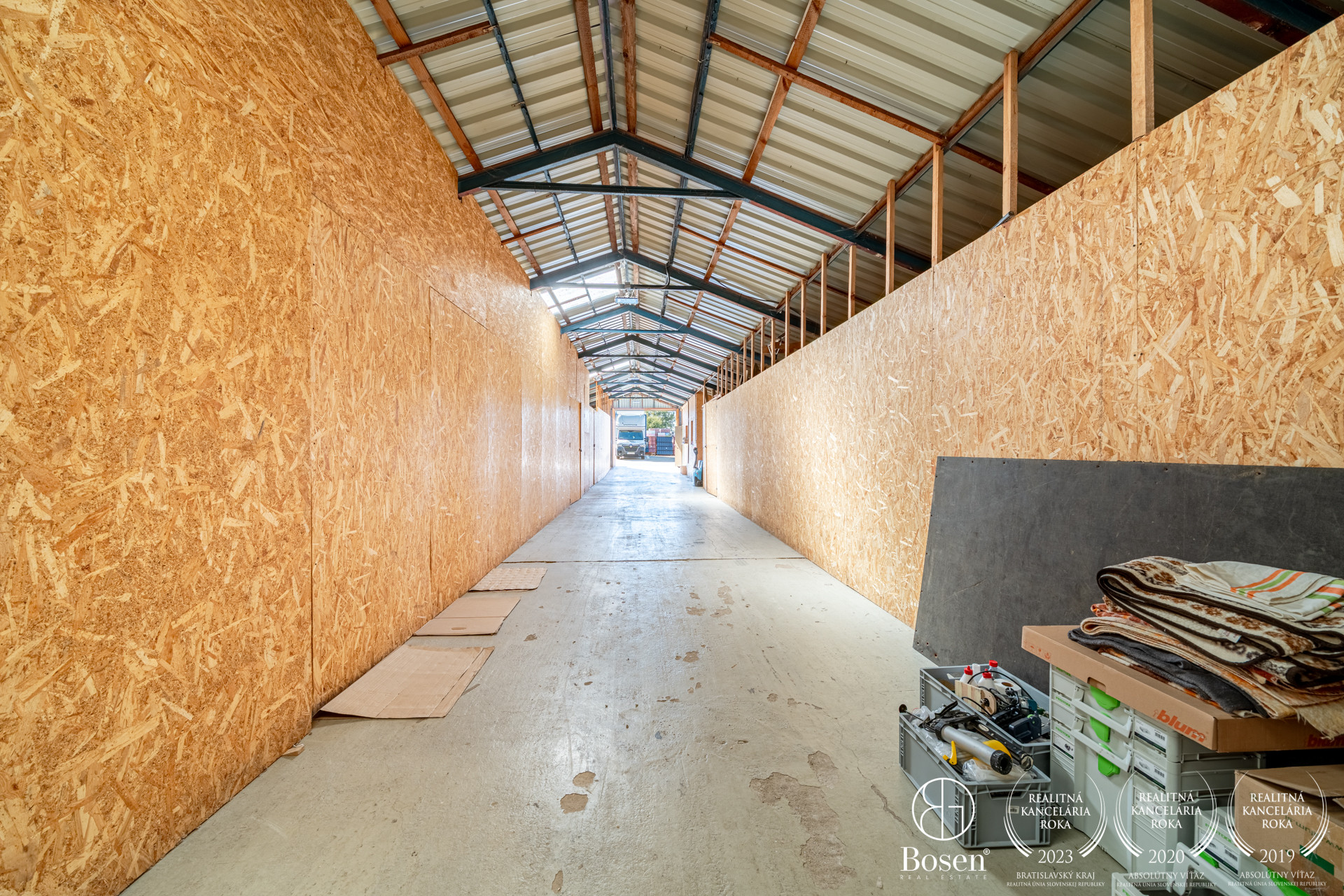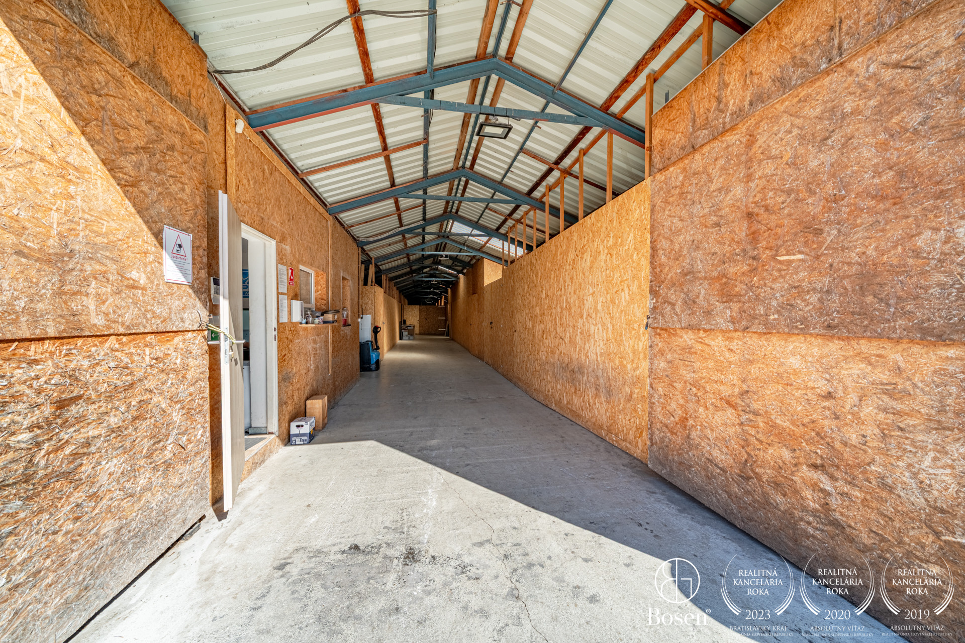 PRIESTOR: Hala má úžitkovú plochu 585 m², pôdorys 50 m × 11,70 m a výšku 4,5 m. V hale sa nachádza vstavaná kancelária. Hala je rozdelená drevenými priečkami na menšie kóje, ktoré je možné meniť podľa potrieb zákazníkov.