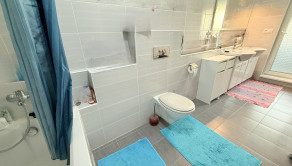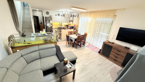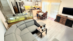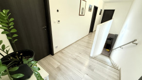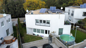 DISPOZÍCIA: Na prízemí domu sa nachádza vstupná chodba, zasklené zádverie, obývačka spojená s kuchyňou s výstupom na terasu, samostatná izba , technická miestnosť, samostatné WC a kúpeľňa so sprchovým kútom. Poschodie domu pozostáva z dlhej chodby, 1 samostatnej spálne so šatníkom a terasou, 2 samostatných izieb s klimatizáciou, zasklenej loggie a priestrannej kúpeľne s dvomi umývadlami, vaňou a WC.