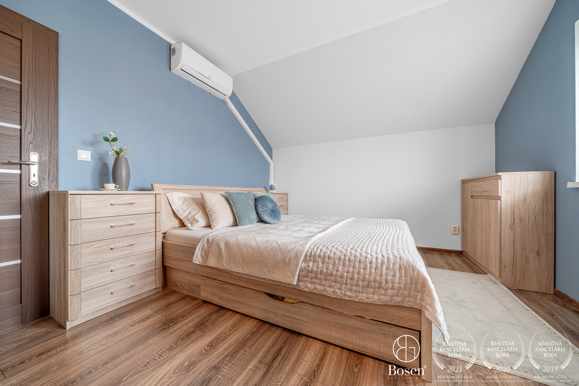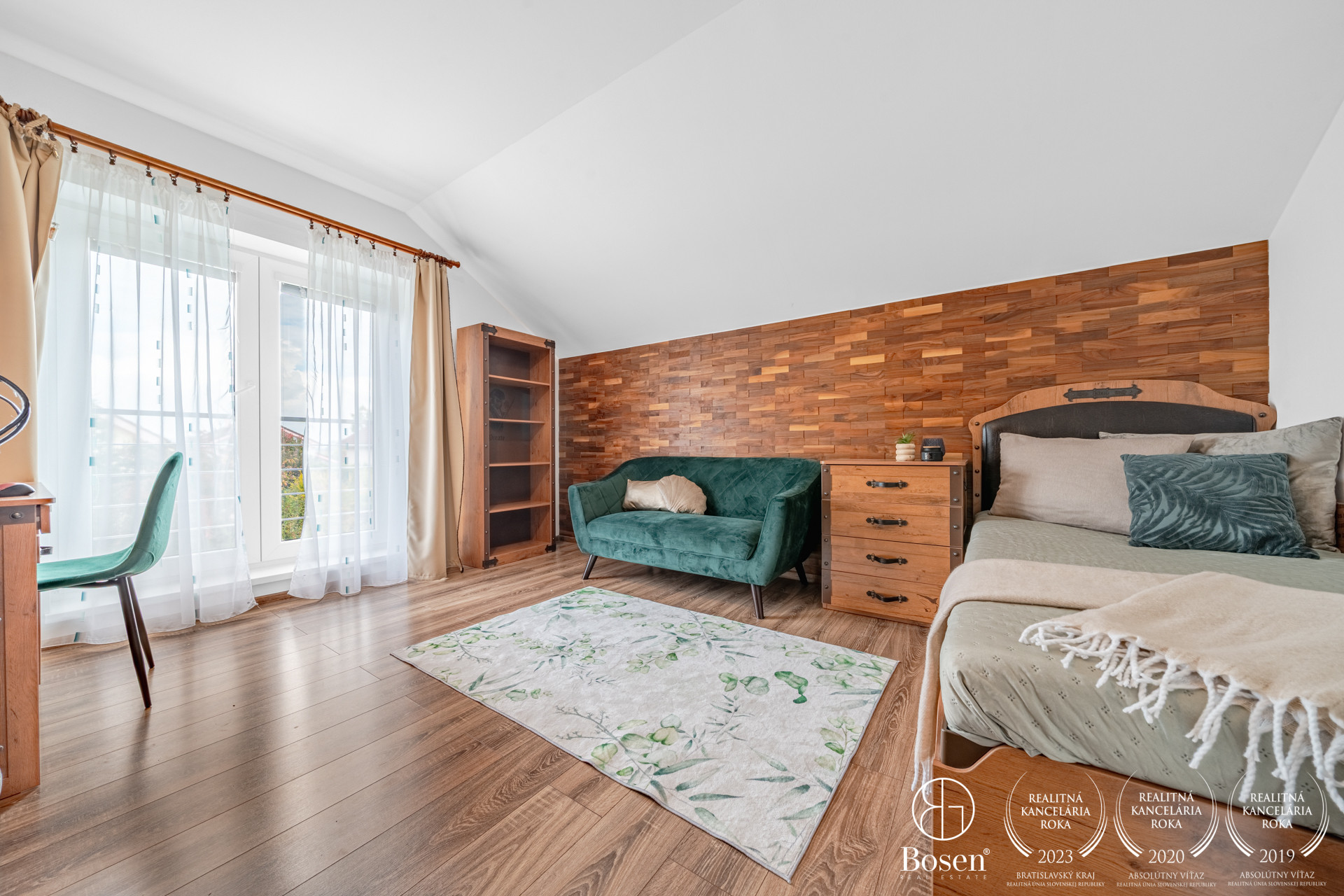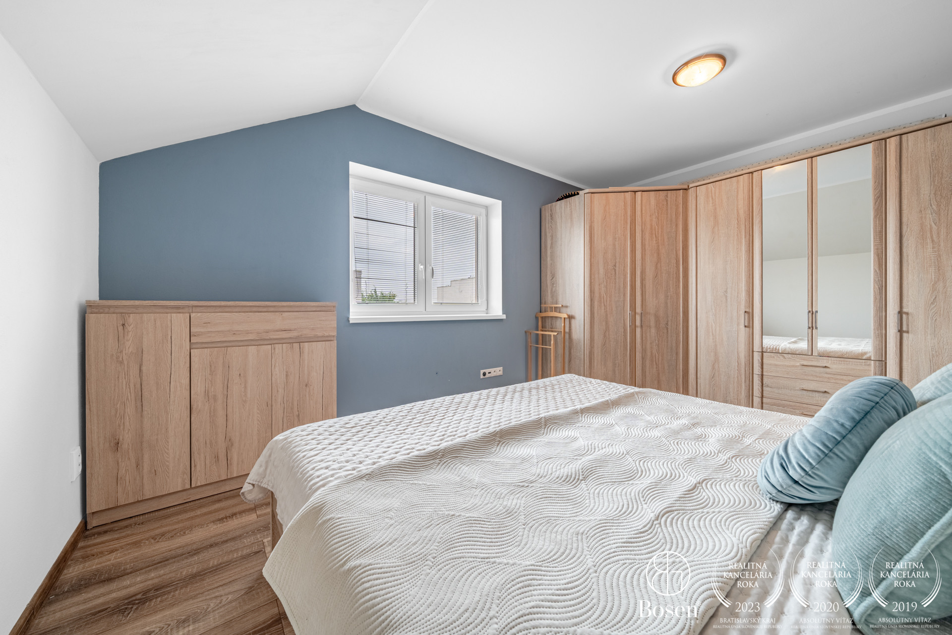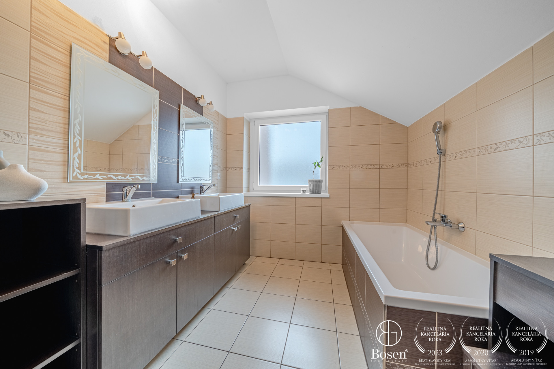 2NP: chodba, kúpeľňa s vaňou, WC a dvoma umývadlami, hlavná spálňa s klimatizáciou, dve samostatné nepriechodné izby vhodné ako dve detské izby, technická miestnosť s plynovým kotlom, práčkou + sušičkou, výstup na povalu, kde je odkladací priestor.