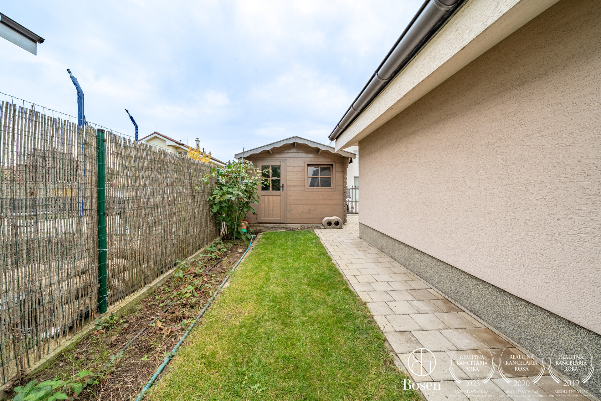 POZEMOK: celková výmera pozemku je 642 m2. Pozemok je veľmi dobre udržiavaný. Závlahový systém s tryskami polieva trávnik aj záhradu po celom obvode pozemku. Priestor pre náradie poskytuje záhradný domček. Pozemok poskytuje dostatok miesta pre deti aj vlastne nápady. Na pozemku je vyvedená pitná voda pre rôzne účely.